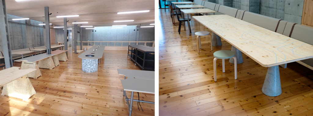 4)下左の写真はインナーテラスを上から撮影。トドマツ厚さ27cmのCLTを菱形に加工し、階段材にしているのがわかります。