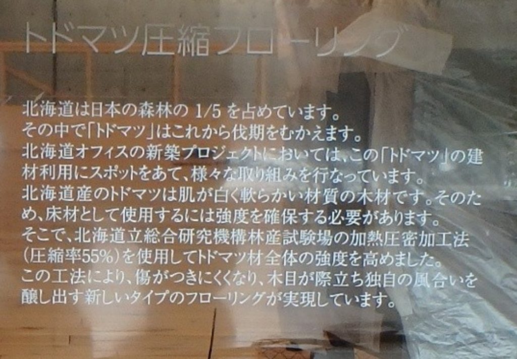 6)オフィスの入り口に「トドマツ圧縮フローリングの説明が掲出してあります